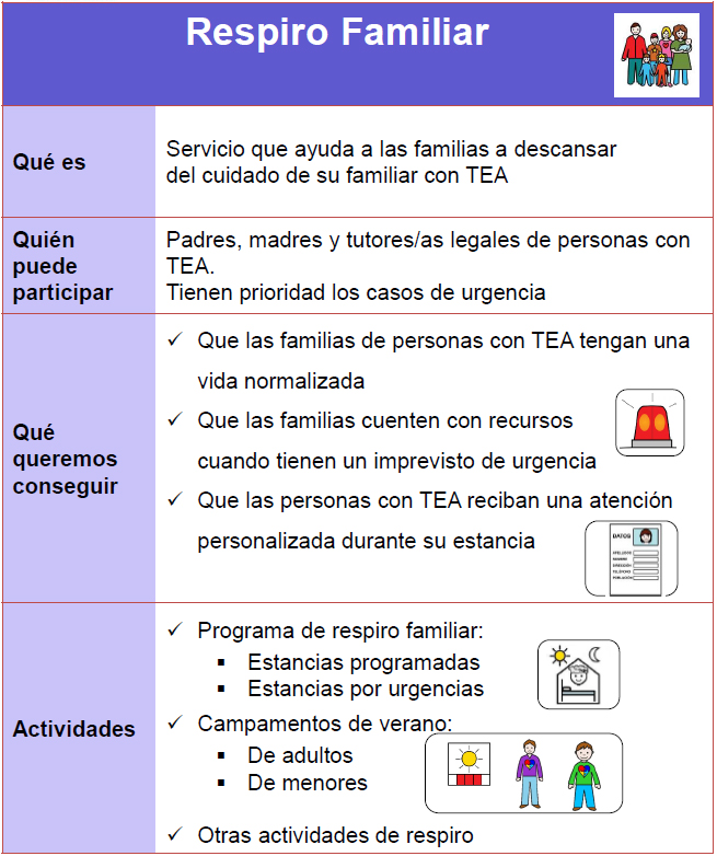 Es un servicio cuya misión es permitir a las familias descansar de la vigilancia y cuidado de su familiar con TEA y disfrutar de su propio tiempo libre contribuyendo a la mejora de la calidad de vida familiar.